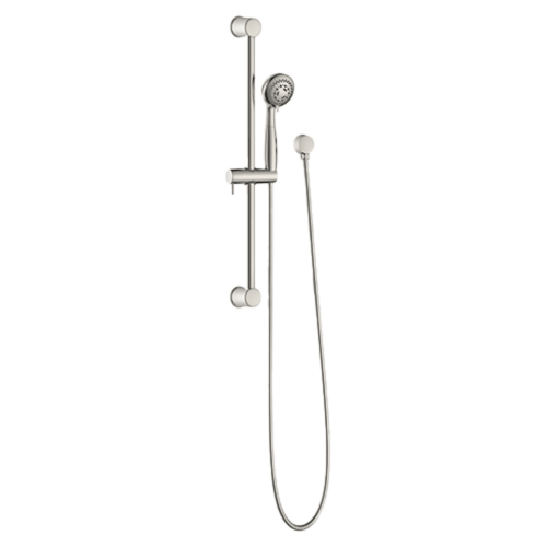 Our Hand Showers feature 72" metal hoses, brass drop elbows and 24" metal slide bars. The chrome and brushed nickel versions come complete with a five function hand shower and non-positive shut off.